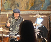 堀越 彰 Akira Horikoshi(Drums & Percussion) 1965年、東京生まれ。海老沢一博 氏、村上”ポンタ”秀一 氏に師事。日舞家の父の影響から日本の伝統音楽を敬愛する。1990年 山下洋輔ニュートリオでデビュー。伊藤多喜雄、夏木マリ、館形比呂一、パパ・タラフマラ、チェンミン、藤井郷子、等と共演。30カ国を超える海外公演に参加する。ピアノ深町純、バイオリン渡辺剛と「The WILL」、薩摩琵琶や尺八など邦楽器と「東方異聞」、パフォーミングアーツ「SOLO-ist」、尺八奏者・小濱明人と「LOTUS POSITION」、シルク・ドゥ・ソレイユのパフォーマー等と「INSTINCT」、クラシックピアノの三舩優子と「OBSESSION」など主催。デヴィッド・ルヴォー演出舞台監督作品に多数参加。都内に2ケ所のドラムスクールをを持つ。 (※今ライブのパンフレットより転載) |
